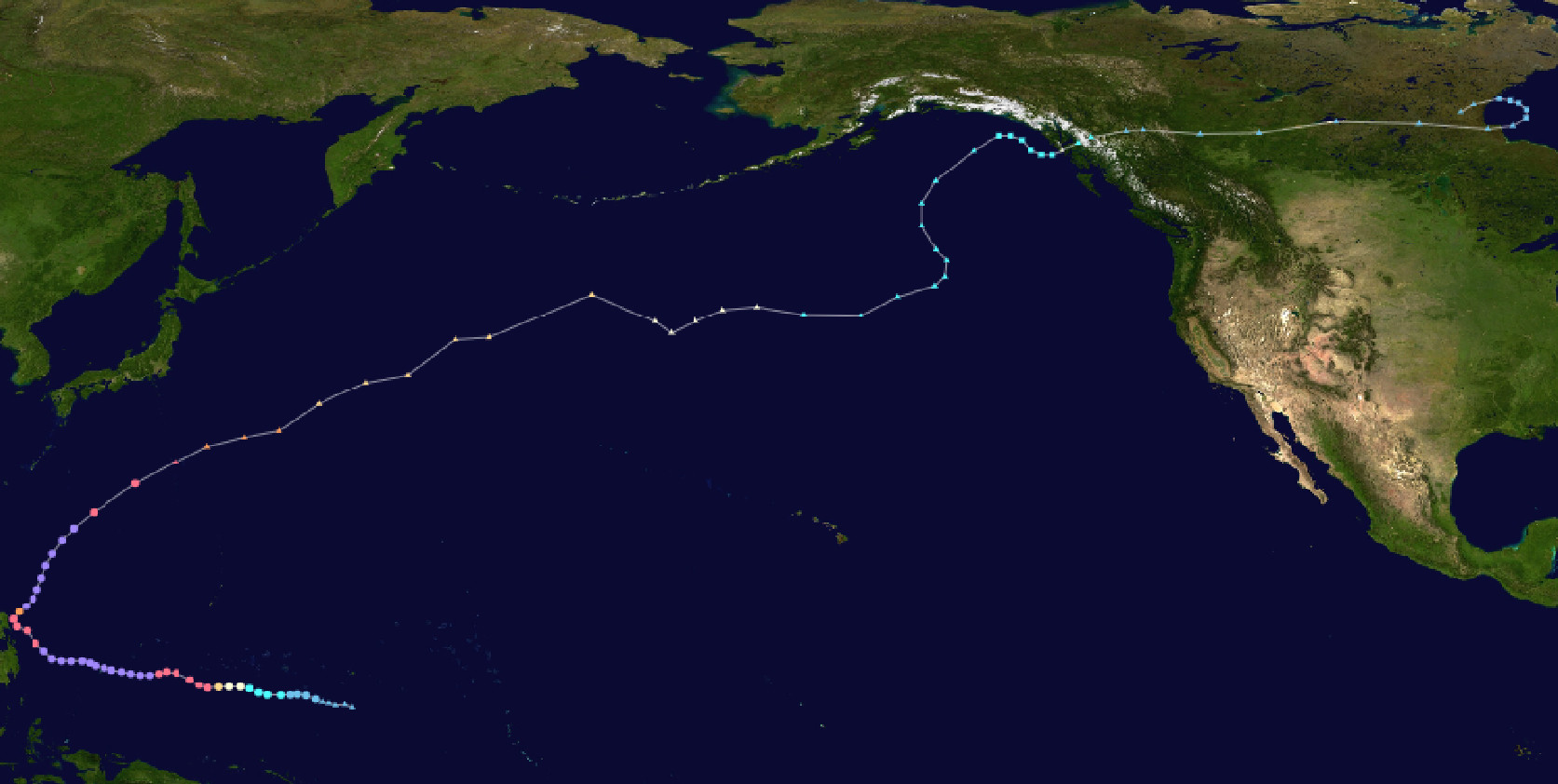 the first half of the track is actually more likely to happen: a strong super typhoon that get caught in a front and turning extratropical at peak intensity?