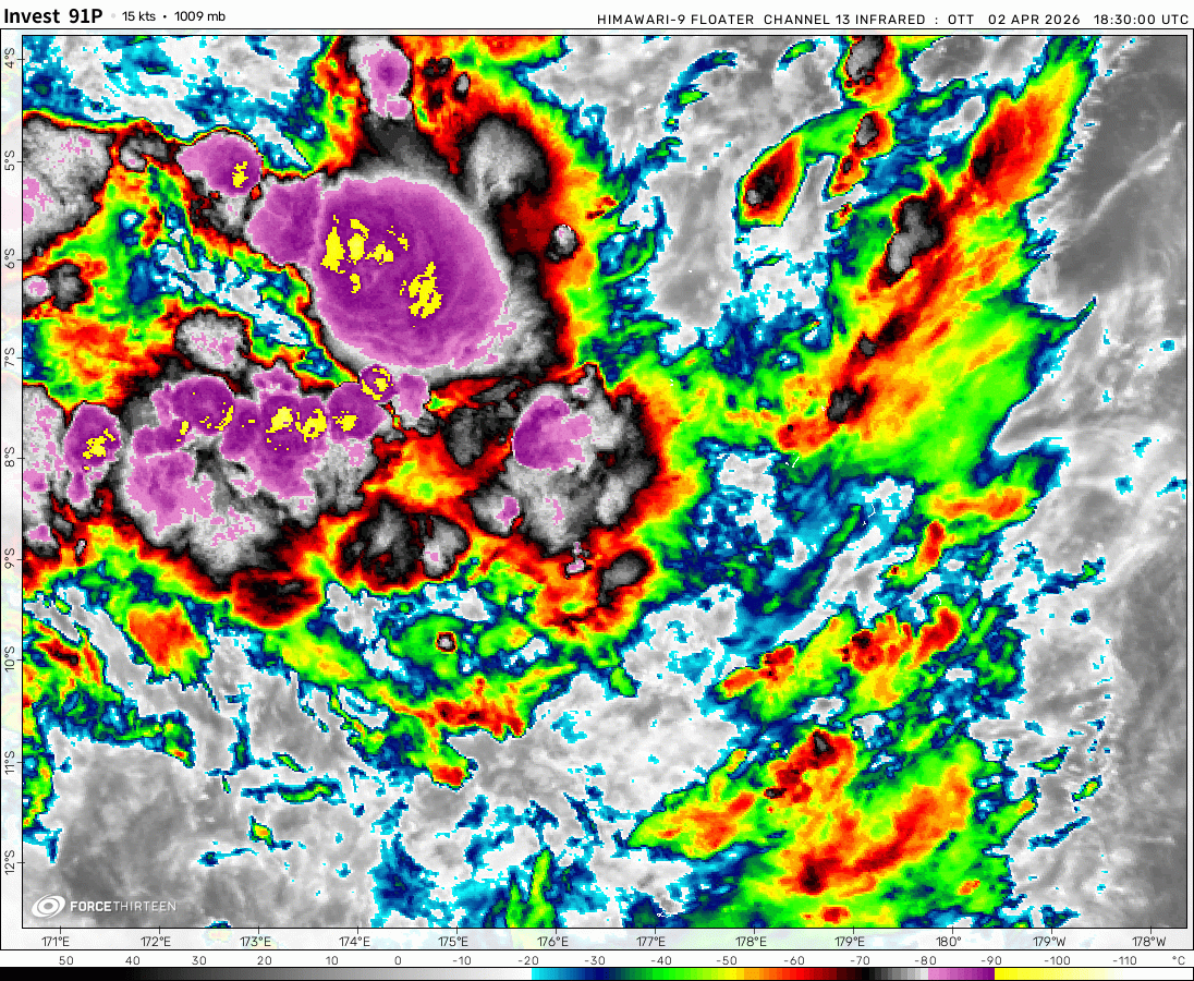 Invest 91P was located near 8.3°S, 176.4°E, or about 659 miles (1060 km) north of Nadi, Fiji. 91P has maximum sustained winds of 15 knots and a minimum central pressure of 1009 millibars.