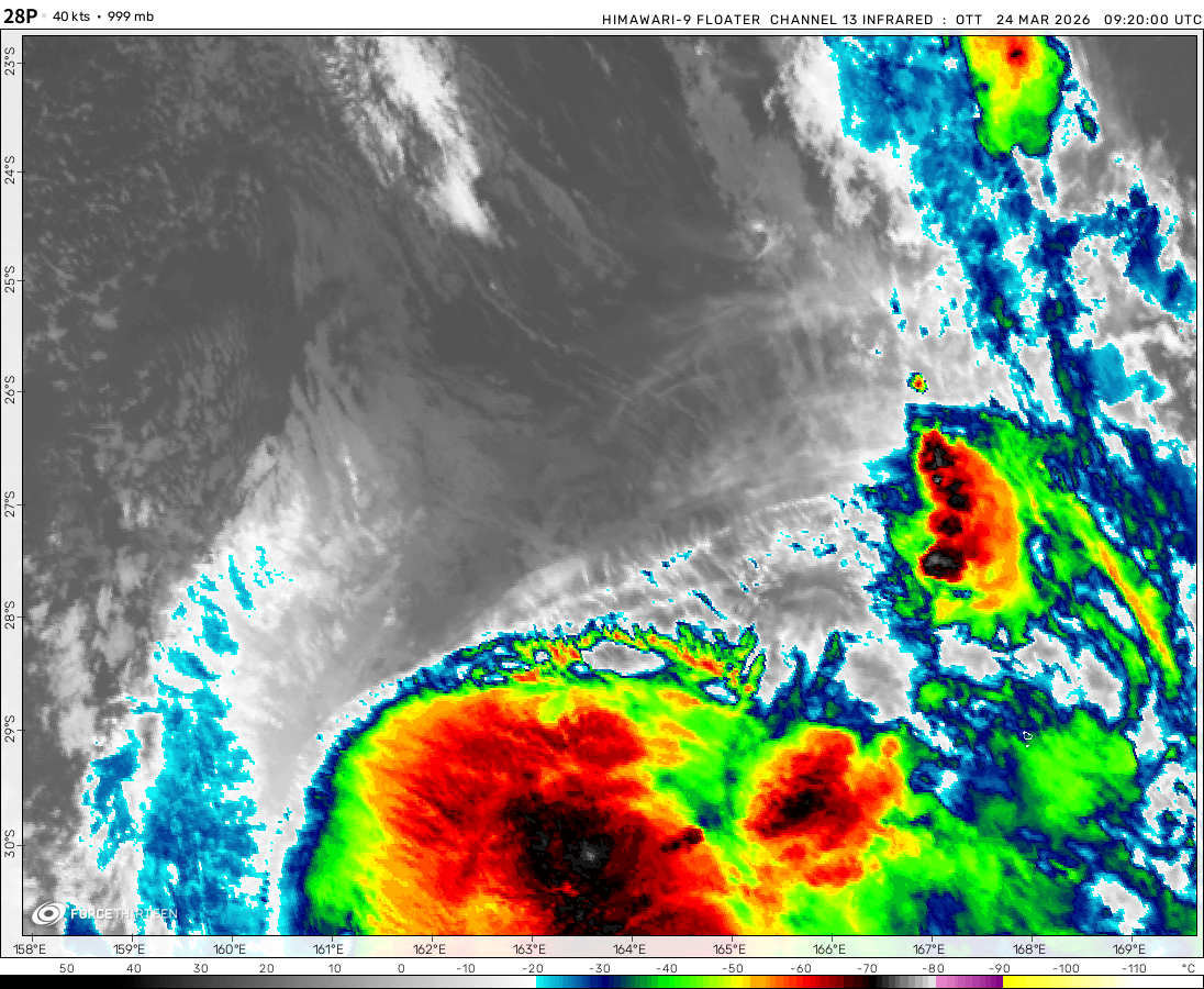 Tropical Storm 28p was located near 26.9°S, 163.7°E, or about 363 miles (584 km) south-southwest of Nouméa, New Caledonia. 28p has maximum sustained winds of 40 knots and a minimum central pressure of 999 millibars.