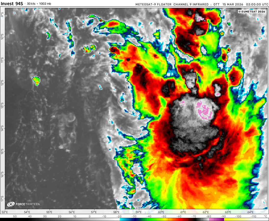 Invest 94S was located near 13.2°S, 59.0°E, or about 491 miles (790 km) north-northeast of Port Louis, Mauritius. 94S has maximum sustained winds of 30 knots and a minimum central pressure of 1002 millibars.