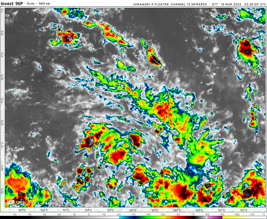 Invest 96P was located near 13.0°S, 160.5°E, or about 249 miles (401 km) south of Honiara, Solomon Islands. 96P has maximum sustained winds of 15 knots and a minimum central pressure of 1009 millibars.