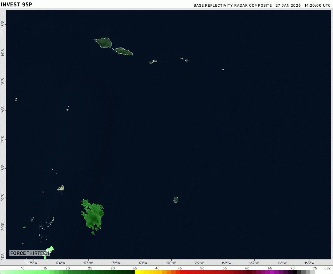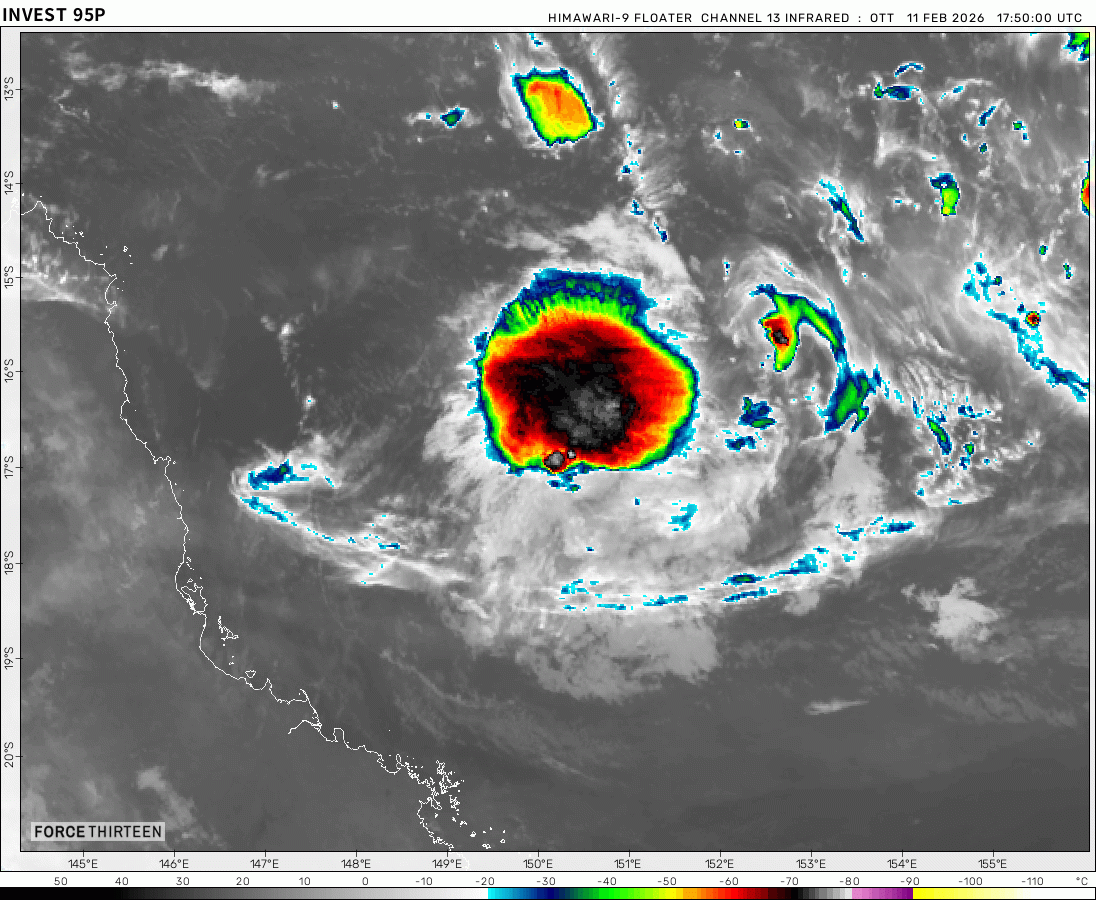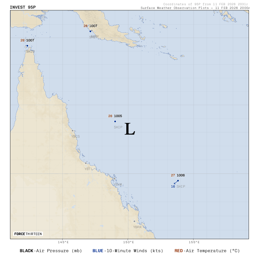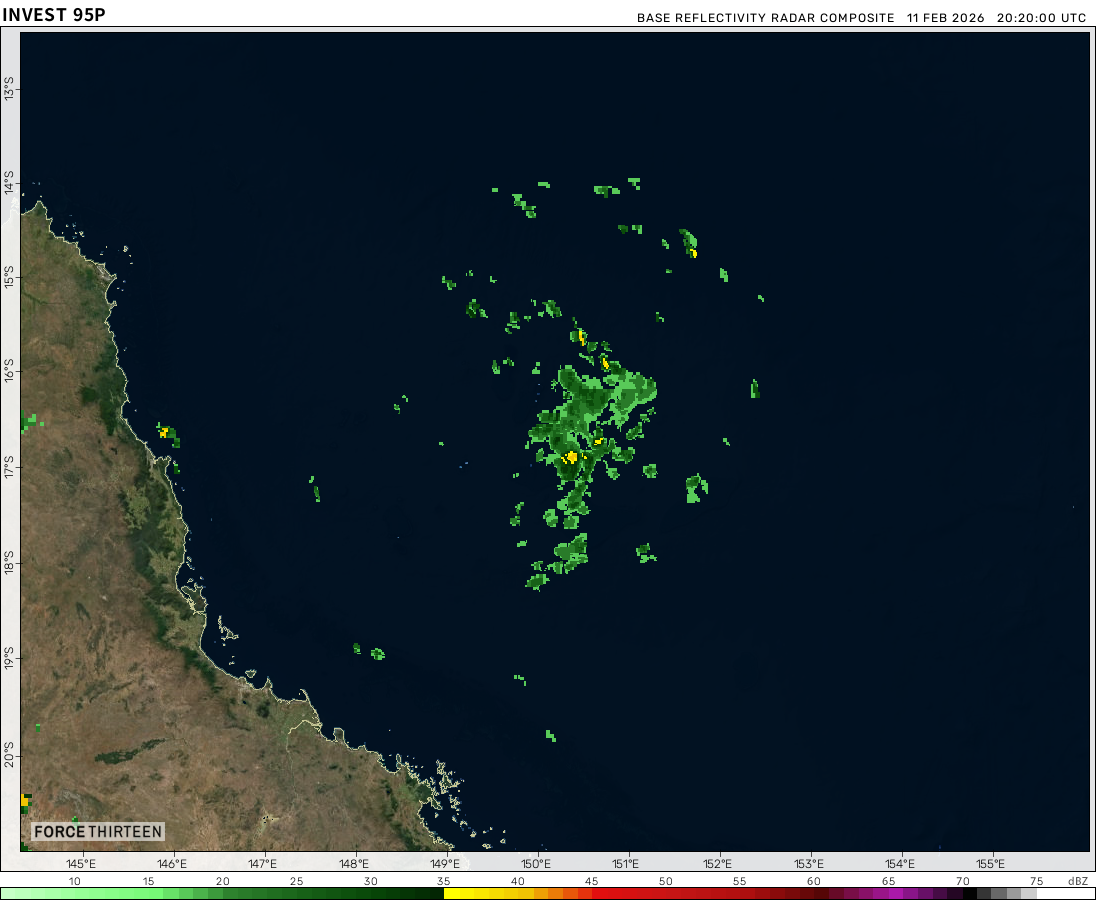 Invest 95P was located near 16.8°S, 150.1°E, or about 36 miles (59 km) south-southeast of Willis Island, Queensland. 95P has maximum sustained winds of 20 knots and a minimum central pressure of 1003 millibars.