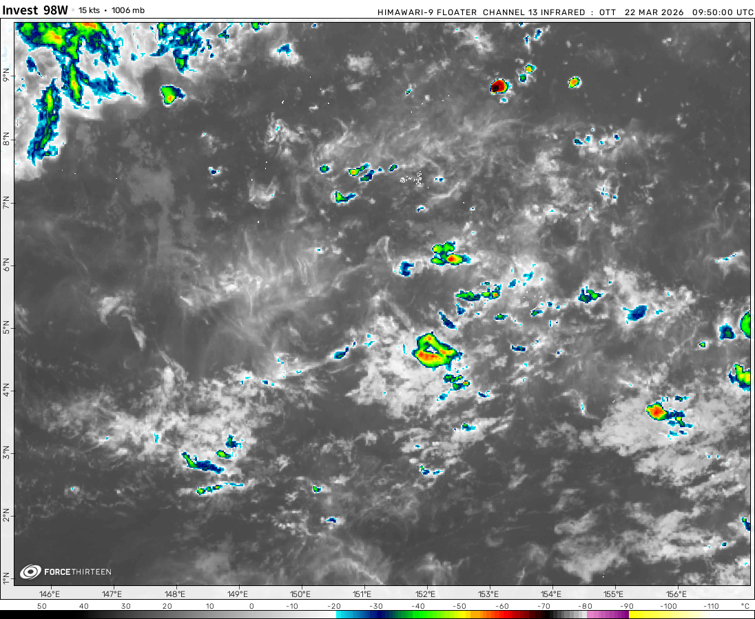 Invest 98W was located near 5.3°N, 151.2°E, or about 159 miles (256 km) west of Chuuk, Micronesia. 98W has maximum sustained winds of 15 knots and a minimum central pressure of 1006 millibars.