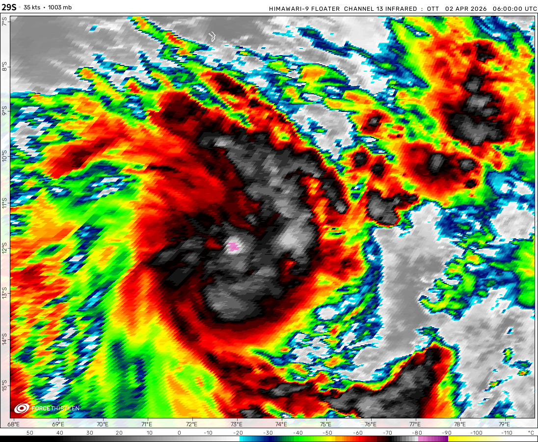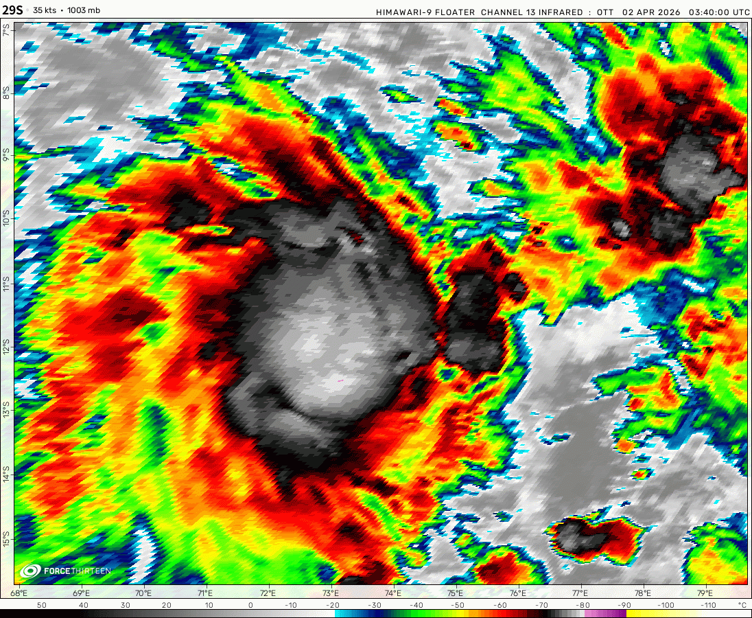 Tropical Storm 29S was located near 11.4°S, 73.7°E, or about 295 miles (475 km) south-southeast of Diego Garcia. 29S has maximum sustained winds of 35 knots and a minimum central pressure of 1003 millibars.