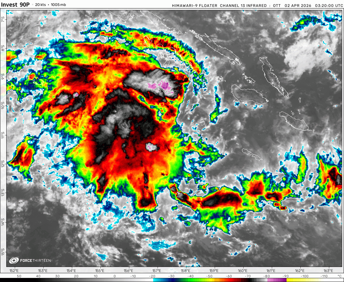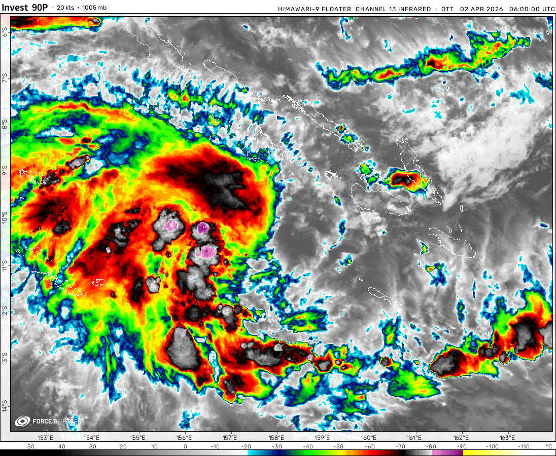 Invest 90P was located near 11.2°S, 157.5°E, or about 207 miles (333 km) southwest of Honiara, Solomon Islands. 90P has maximum sustained winds of 20 knots and a minimum central pressure of 1005 millibars.