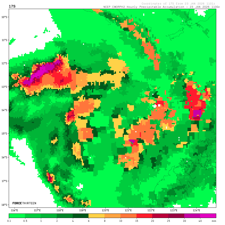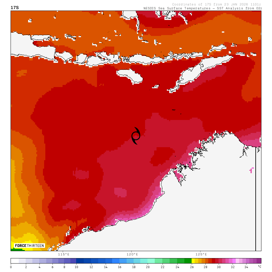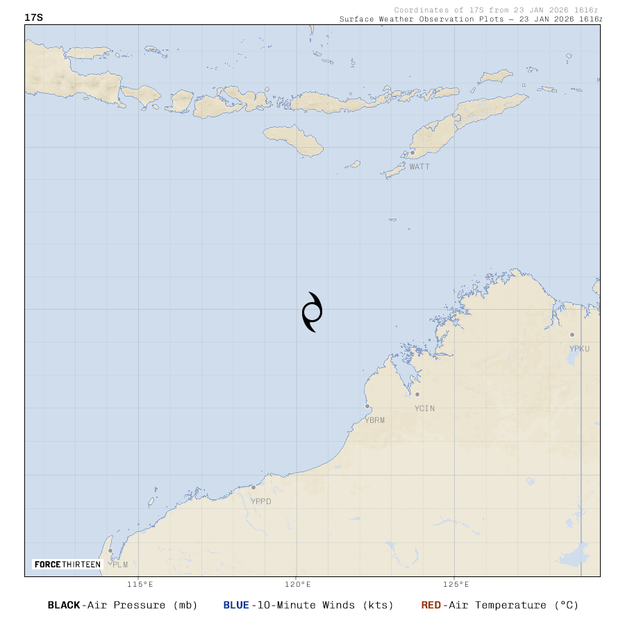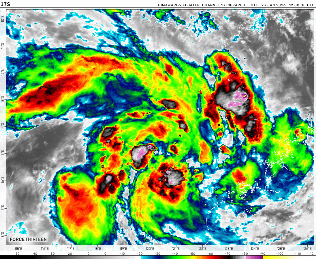 Tropical Storm Seventeen was located near 14.9°S, 120.7°E, or about 235 miles (378 km) north-northwest of Broome, Western Australia. Seventeen has maximum sustained winds of 40 knots and a minimum central pressure of 996 millibars.