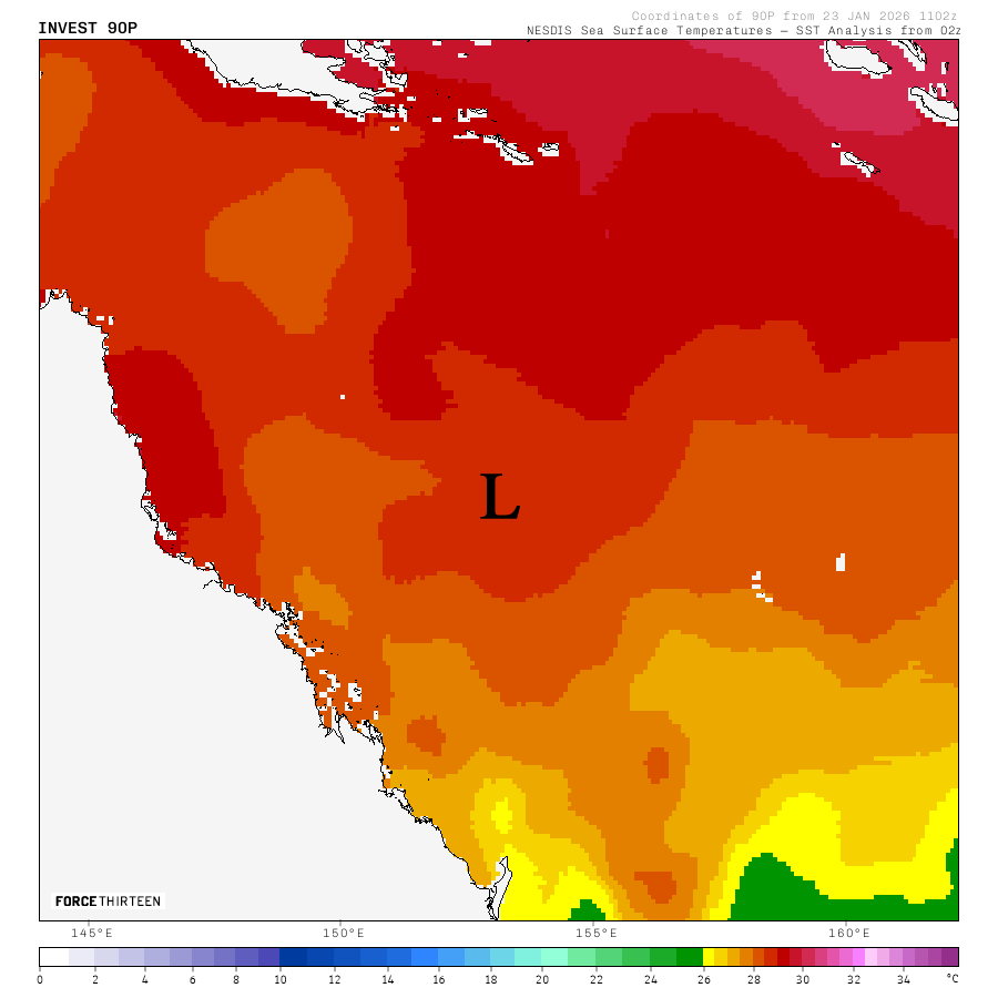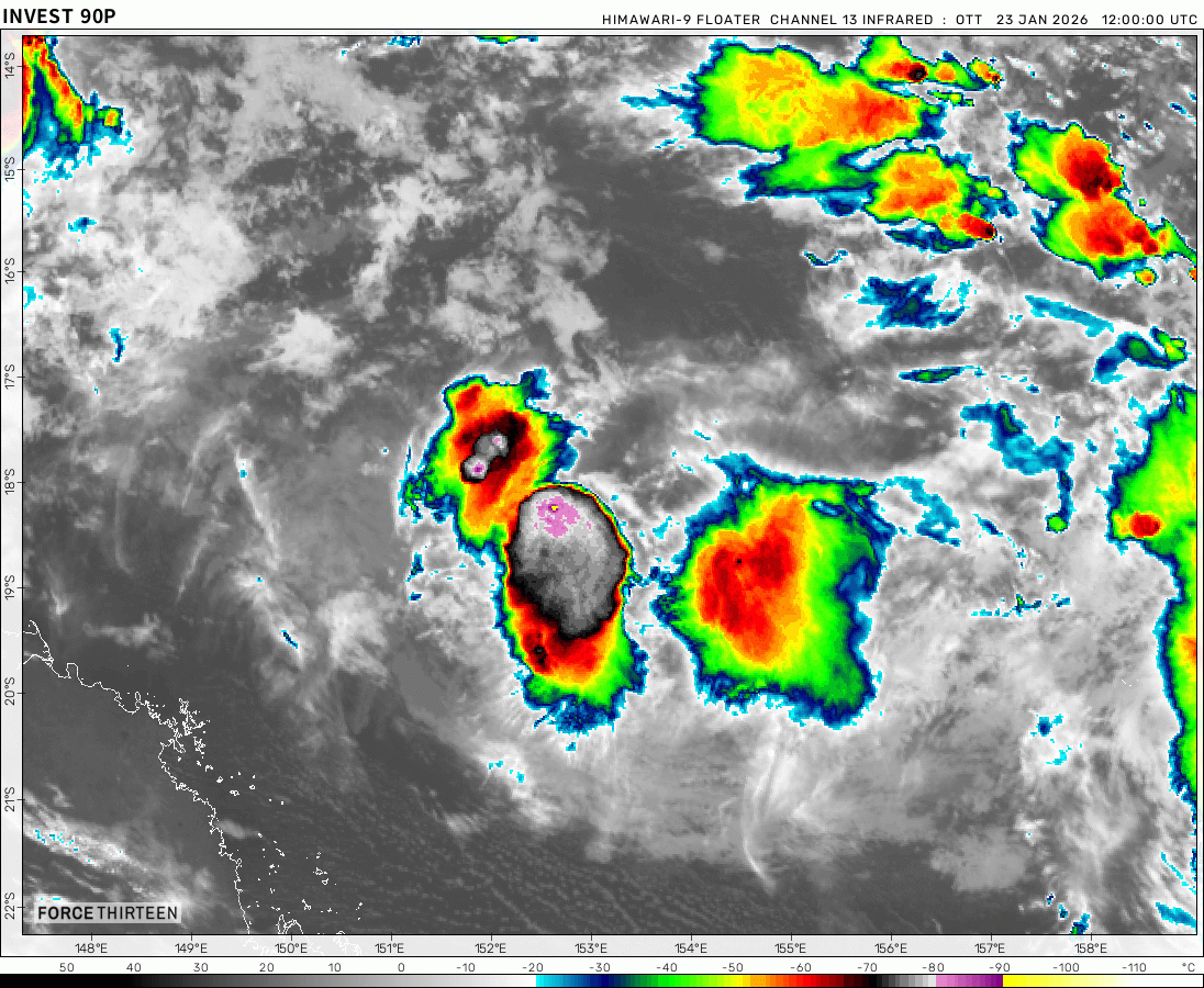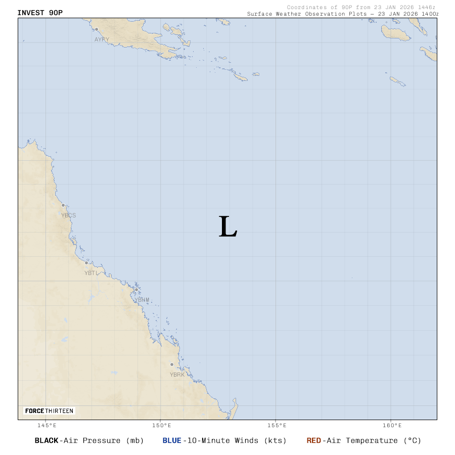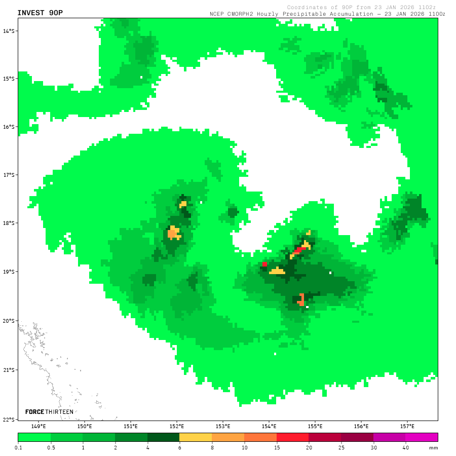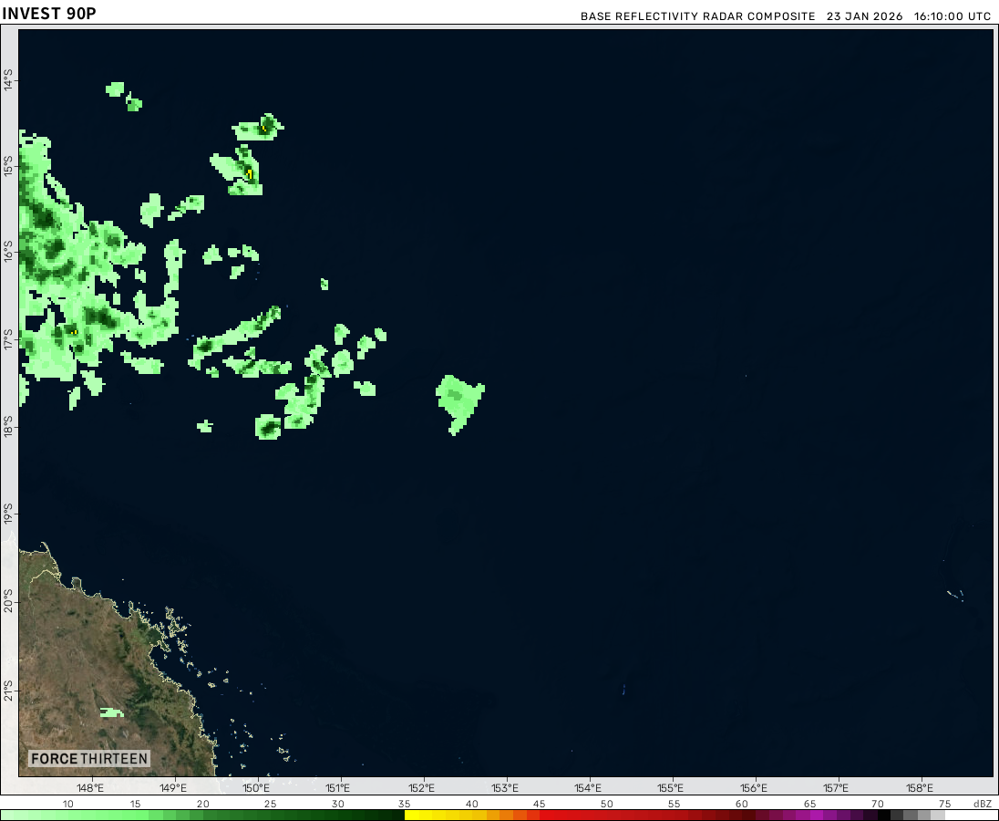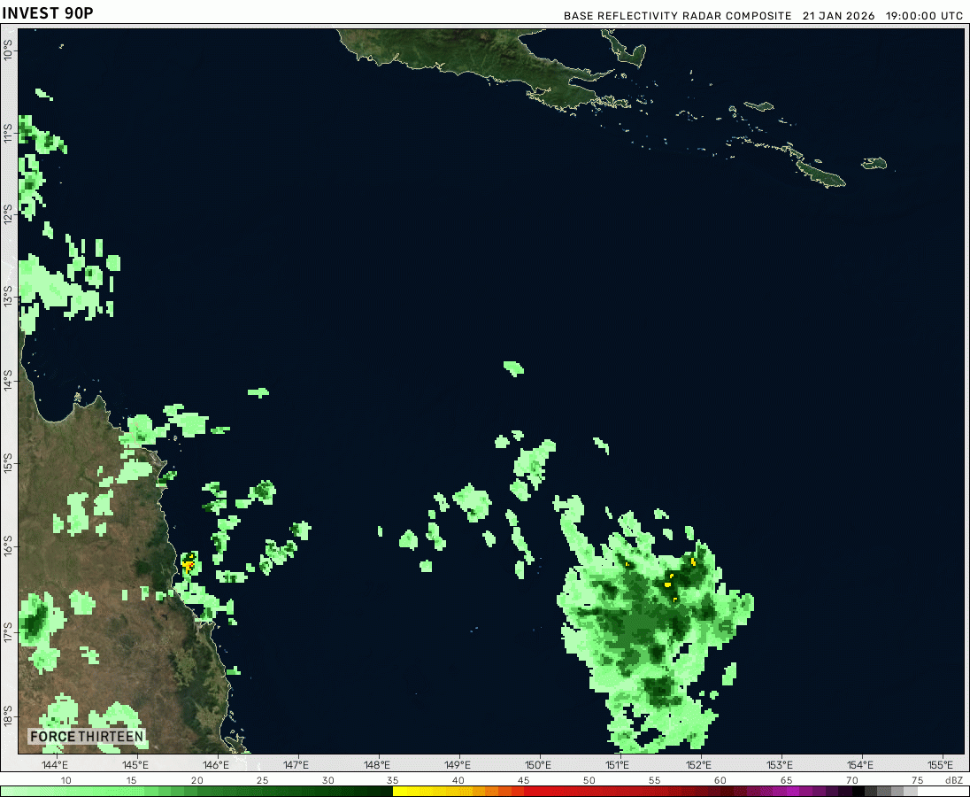 Invest 90P was located near 17.8°S, 152.9°E, or about 85 miles (137 km) east-southeast of Lihou Reef, Queensland. 90P has maximum sustained winds of 25 knots and a minimum central pressure of 997 millibars.