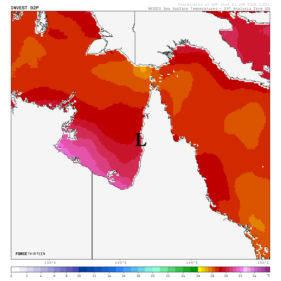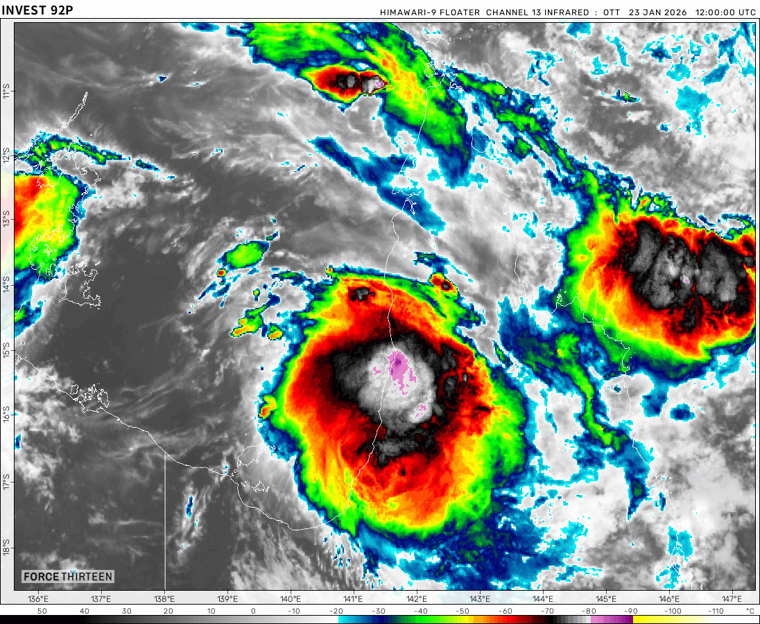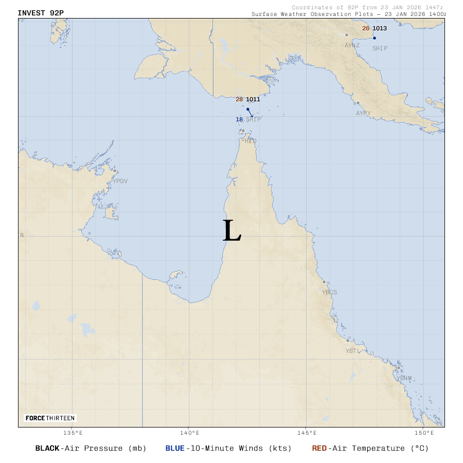 Invest 92P was located near 14.8°S, 141.8°E, or about 149 miles (239 km) south of Weipa, Queensland. 92P has maximum sustained winds of 20 knots and a minimum central pressure of 1006 millibars.