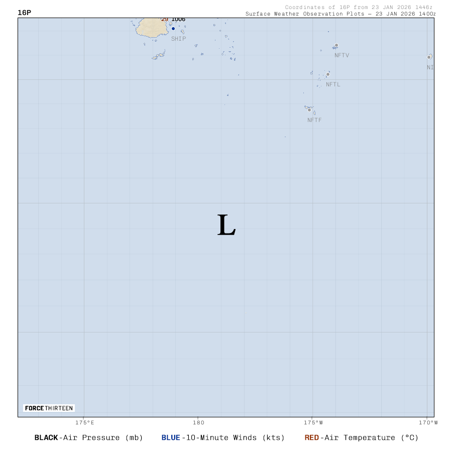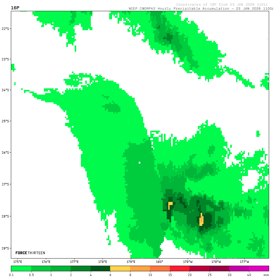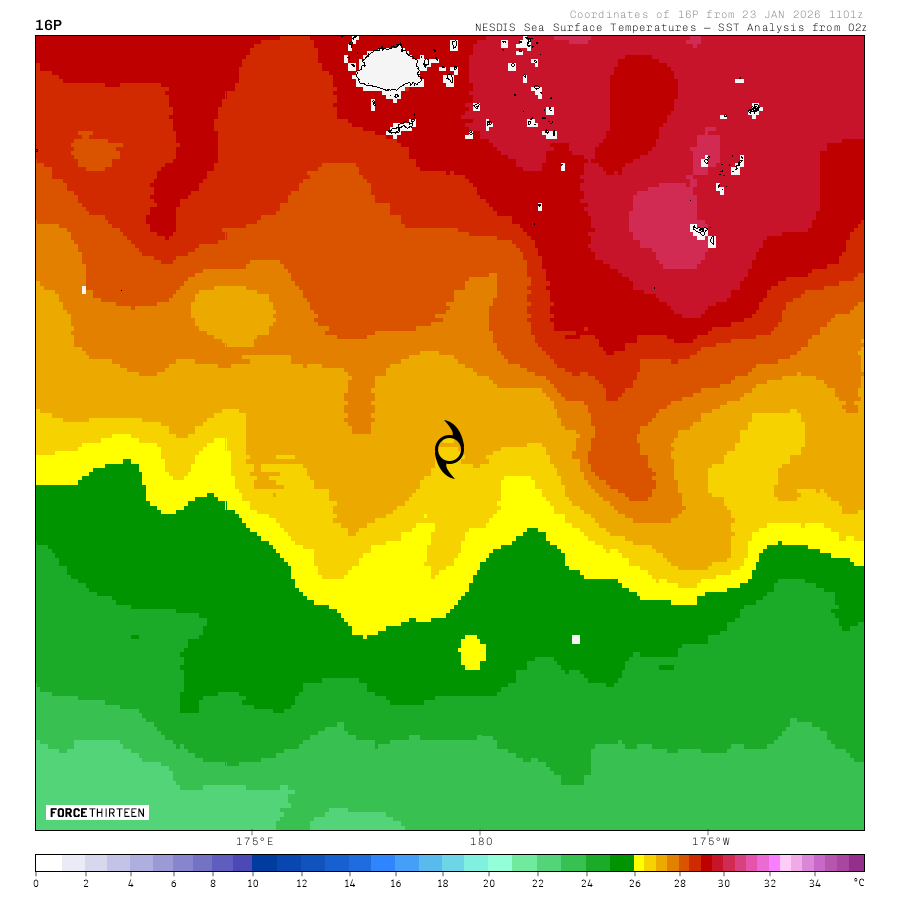 Tropical Depression Sixteen was located near 25.9°S, 178.8°W, or about 400 miles (644 km) southwest of Tonga. Sixteen has maximum sustained winds of 30 knots and a minimum central pressure of 999 millibars.