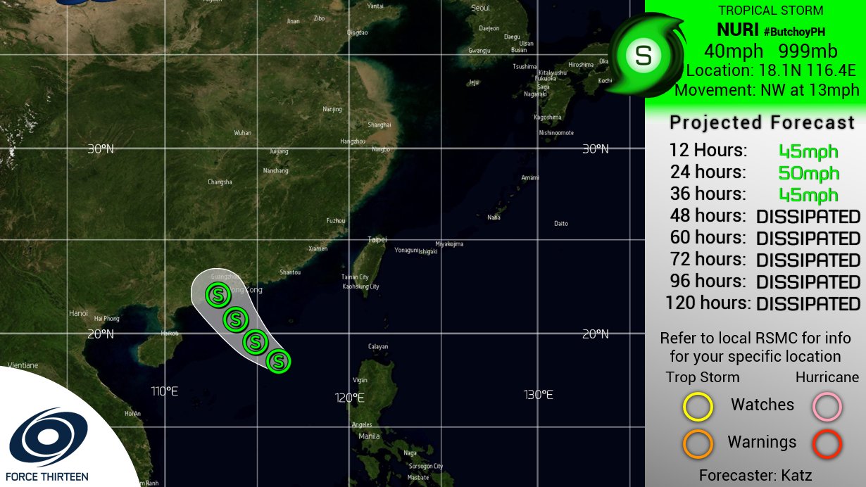 Nuri is forecasted to gradually transition to a more uniform Northwestward movement while approaching the southern coast of China. The current forecast expects Nuri to peak as a low end Tropical Storm of 45 mph (40 knots, 75 km/h) tomorrow before making a weaker 40 mph (35 knots, 65 km/h) landfall a fair distance West of Hong Kong. Gusts could be up to 50 mph (45 knots, 85 km/h). Even outside of the forecasted landfall position, flooding rains and strong winds are likely/possible in the area in and around it.